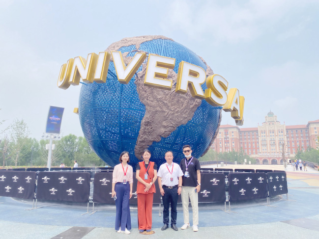 旅游与航空服务学院分党委副书记桂毅与校企合作单位陈小丽副总经理(左一)共同考察北京环球影城