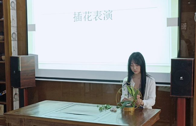 茶韵幽香还未散去,馥郁花香扑鼻而来。在茶艺展示之后,花之舞协会成员在悠扬的古筝琴声中开始了插花表演,姹紫嫣红的花在插花师纤纤素指下舒展着自己柔媚的腰肢。表演者在展现精炼插花技艺的同时,讲述了插花起源发展、特点与搭配技巧,让观众直呼过瘾频频点赞。