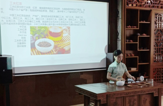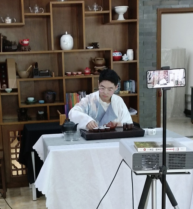 此活动采取线上抖音直播的方式进行,茶艺协会的同学为线上观众介绍了绿茶、红茶以及乌龙茶的相关知识且现场展演了其冲泡技艺,冲泡手法娴熟且优雅,引来抖音平台上百人的观看。主持人从茶的起源发展以及冲泡注意事项进行了全面详细的介绍,让屏幕前的观众对茶有了更深层次的理解,对茶艺技能有了更直观的印象。