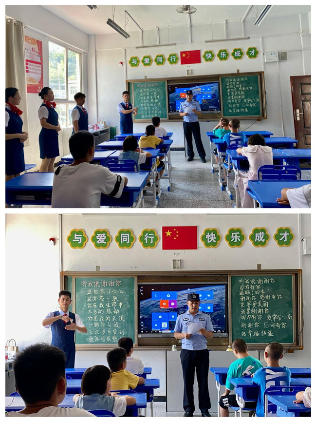 8位残疾儿童端坐在教室里,虽然有的还很好动,但看着眼前穿着制服的警察叔叔和大哥哥大姐姐,眼神里充满了好奇。“同学们,现在正值夏季高温,我来给大家介绍防溺水的一些注意事项……”宣恩县公安局珠山派出所民警陈根利第一个上台,为孩子们讲解防溺水知识等。一旁,旅游学院学生尹爱军同步打着手语,向聋哑学生翻译。“手语是根据课件来学的,练了两天,还不是很熟练,但我会重复几次,希望让残疾学生们能看明白。”尹爱军说。