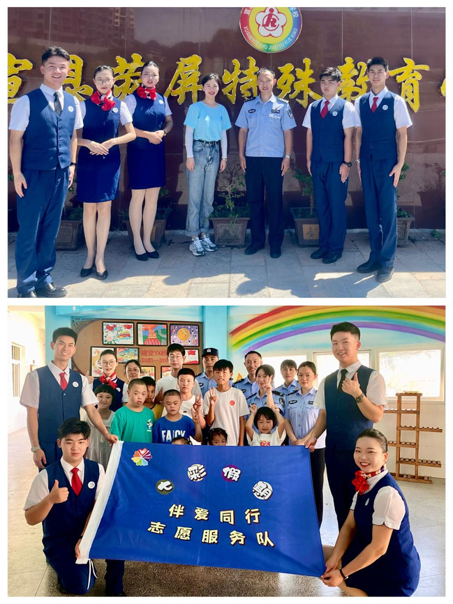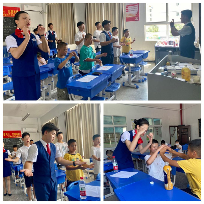民警授课结束后,志愿团队开始了一场模拟情景剧。“小朋友们和警察叔叔阿姨手牵手,在教室门口等待安检,一起乘飞机。”在辅导员刘梦的指挥下,孩子们高兴地站起来,整齐排着队,挨个安检、测体温,走入教室里的“机舱”,坐在课桌前和警察叔叔阿姨聊个不停。“哇,这样就是坐飞机了,好有趣,我今后要去坐真正的飞机。”残疾儿童小杰(化名)笑着说。