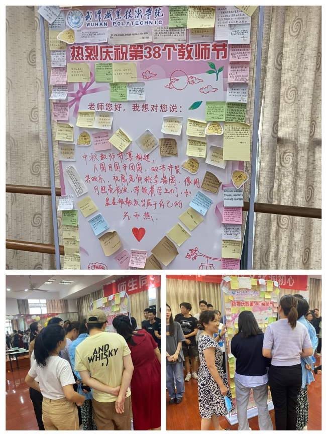 在最后“话真情,念师恩”活动环节中,学生代表邹子锐分享了“我与老师的那些事儿”,讲述了辅导员陈心怡老师给他留下的难忘的感人事迹。“敬爱的老师,您的教诲如春风,似瑞雨,永铭我心。亲爱的老师,我虔诚的祝福您:节日快乐!”这些发自肺腑的心里话被一个个学生们粘贴在了宣传展板上,字里行间流露的都是学生对老师的恩情;当《栀子花开》沁人心脾的歌声萦绕在老师们的耳旁,伴随着同学们齐声“老师您辛苦了,老师谢谢您!”时,感动的泪水瞬间夺眶而出,这一幕温馨的画面也记录下了教师伟岸的身影。
