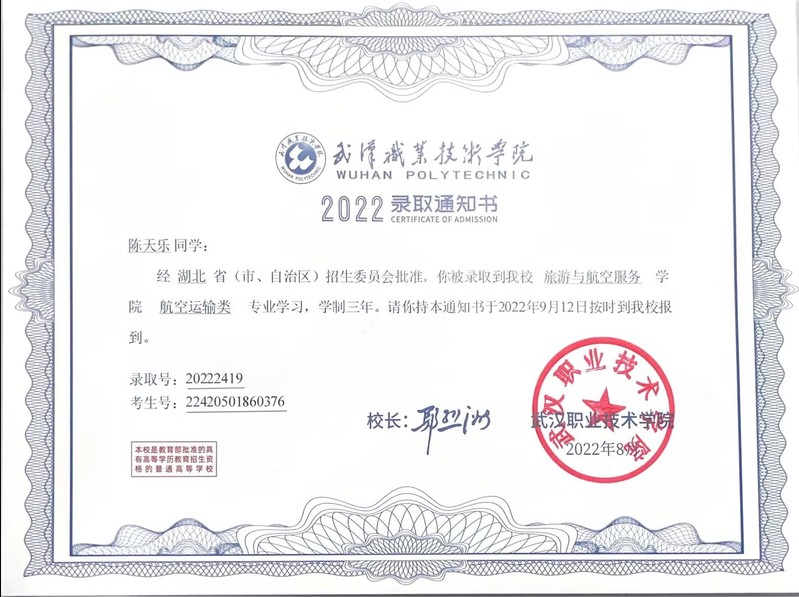 陈天乐的录取通知书