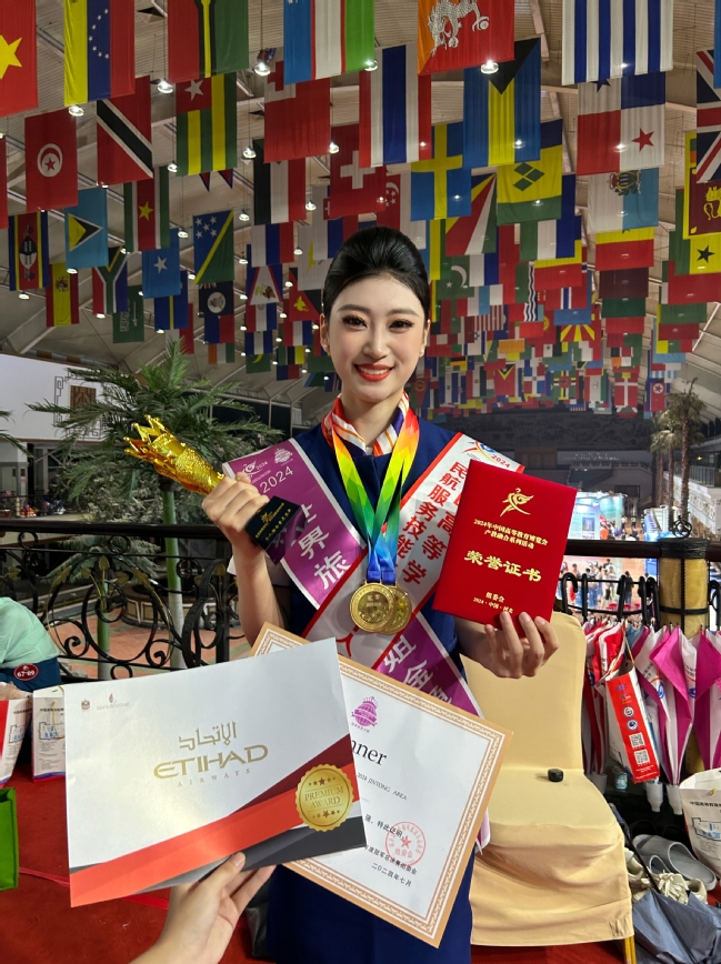 在第十四届全国高等学校民航服务技能大赛这一高水平竞技舞台上,谢淑雯同学凭借其扎实的专业知识和出色的应变能力,在激烈的竞争中脱颖而出,荣获高职高专组个人综合素质亚军的殊荣,并成功入选2024年世界旅游小姐金通赛区15强。谢淑雯在大赛中的成就,是她勤奋学习和不懈努力的结果。她表示:“我非常感激学院为我们提供了这样一个展示自我、锻炼能力的平台。通过校企合作,我们得以在真实的工作场景中应用所学,这种实践机会极大地提升了我们的职业技能。老师的教学内容与行业需求紧密结合,确保了我们所学的知识、所获得的证书与未来的工作岗位高度相关。”