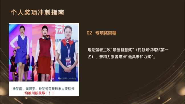 班会上还宣讲了奖项攻略与目标激励。个人奖项方面,设有综合素质奖,要求总分领先且网络票数≥25万,建议同学们每日发布训练Vlog引流。此外,还有专项突破奖项,如“最佳智慧奖”和“最具亲和力奖”,分别适合理论强者和亲和力强者。团体奖项方面,要求全员理论成绩进入前300名,并采用“田忌赛马战术”,强理论组主攻“知识英语单项奖”,强实操组保障“安全技能单项奖”。终极奖励包括阿提哈德航空培训学院免费游学机会,授予个人综合前三名、最佳人气前三名、主持冠军。