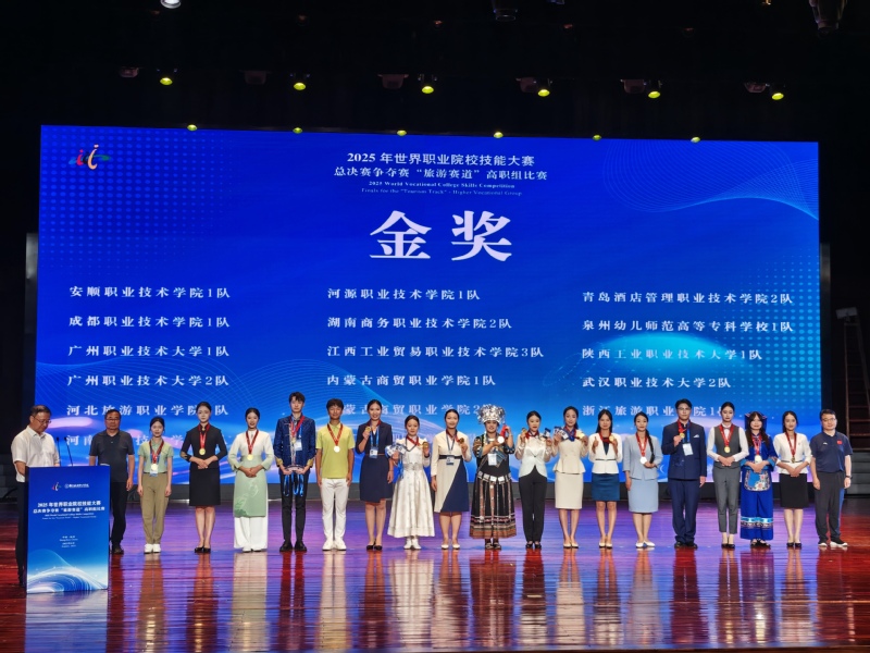 新闻网讯(通讯员 刘丽莉)8月27日,2025年世界职业院校技能大赛总决赛争夺赛旅游赛道(高职组)在杭州圆满落幕。武汉职业技术大学旅游管理专业吴梓仪、李俊杰、刘小渲、方泽宇组成的团队,以沉着冷静的心态和出色稳定的赛场表现脱颖而出,为学校赢得2025年世界职业院校技能大赛金奖。