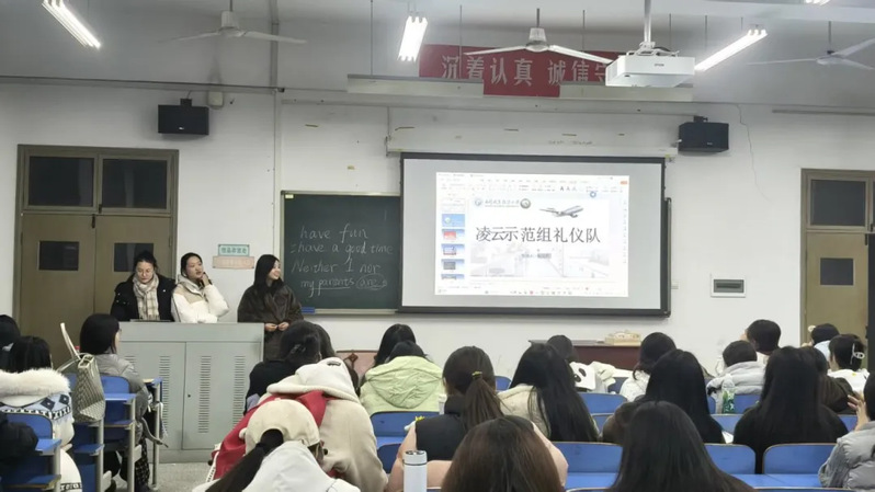 新闻网讯(通讯员 汪波)为进一步提升武汉职业技术大学空乘专业学子的职业素养与形象塑造能力,2025年12月16日晚,空中乘务教研室联合校企合作单位——广慧金通教育科技有限公司驻武职大工作处开展“凌云”领航,妆点未来特色晚自习活动。2024级空乘专业“凌云”示范组成员走进2025级自习教室,通过实操教学与经验分享,为学弟学妹们带来了一堂生动而实用的职业形象塑造课。