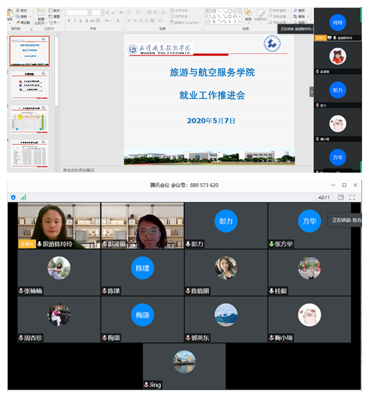 武职讯网(通讯员陈玲玲)5月7日中午,旅游与航空服务学院通过“腾讯会议”平台召开2020届毕业生就业工作推进会,该院党委书记周杏珍、副书记桂毅,校企合作单位北京广慧金通教育科技有限公司驻武职工作处主任陈小丽、副主任张楠楠,以及全体毕业班班主任相约线上,结合当前就业形势,围绕“不讲困难、不谈条件,有态度即有办法”主题展开交流讨论,为全力推进毕业生就业工作出谋划策。