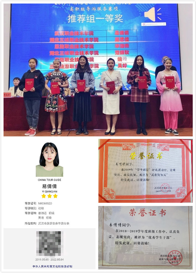 易倩倩,旅管17303班班长,学习成绩每年稳居班级前三,在校期间除获得武职好标兵、武职好学干等荣誉之外,还成功通过导游证、英语四级考试,并获得2018年湖北省导游大赛一等奖第一名,现被武汉轻工大学录取,加上毕业证书,同学们都笑称她为“喜提五证的全能学霸”。