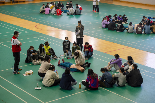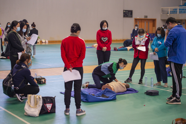 18日上午,湖北省红十字会一行18人来到我校,在体育馆为培训班学员进行现场教学,开展实操培训。在心肺复苏操作课上,学员们利用模拟人进行实际演练。通过情景模拟,完成了对晕倒病患从判断呼吸及意识,到心脏按压、AED除颤,以及口对口人工呼吸等一系列心肺复苏的正确操作及注意事项。