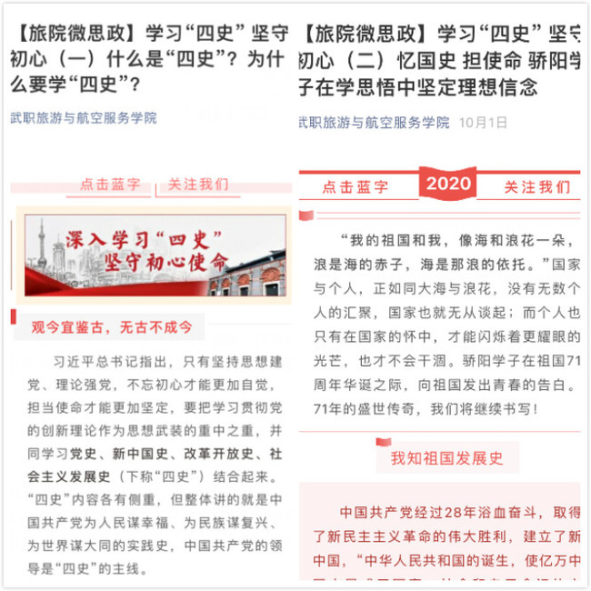在制定“四史”学习方案后,旅游与航空服务学院组织骄阳学子开展多种形式的学习活动。他们通过“云”游红色展馆、学习强国APP、共产党员学习网等网络平台,在该院官方微信公众号上推送“四史”知识、阅读党史书籍等线上线下相结合的形式重温“四史”。