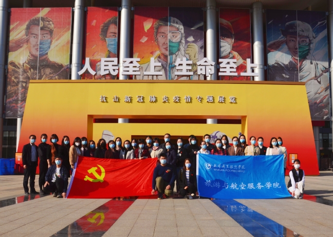 武职网讯(通讯员周雯 摄影马瑞阳)11月12日下午,旅游与航空服务学院党委组织全体党员和发展对象、入党积极分子代表共40余人前往武汉客厅,观看“人民至上 生命至上”抗击新冠肺炎疫情专题展览。