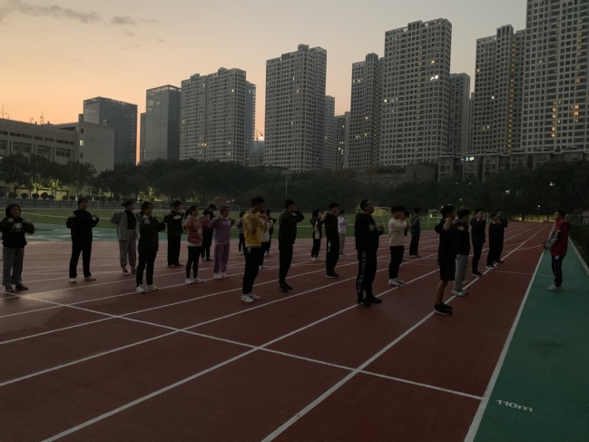 由于白天课程很满,中午又有团课、党课等各种活动冲突,队员们只能利用清晨上课前和晚九点下课之后的时间排练。61名队员,每天清晨在宿舍门口等着宿管阿姨开门,晚上在宿舍关门前1分钟跑回宿舍,紧凑的学习和训练,时间被安排得毫无间隙,忙的时候有些队员甚至连饭都顾不得吃。
