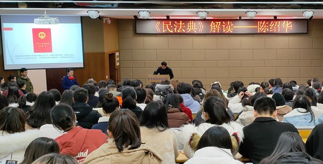 “《民法典》被称为‘社会生活的百科全书’,是新中国成立以来第一部以“法典”命名的法律。《民法典》的颁布,是制度自信的体现。”陈绍华从民法典的编纂历史及其重要意义、特点等方面入手,旁征博引、深入浅出地对《民法典》作系统而详细的解读。他结合“见义勇为”“高空抛物”“高利放贷”等社会现象对《民法典》中值得关注的热点进行梳理,让与会师生对民法典的重大意义以及如何贯彻实施有了更深刻的认识。最后,他从学校实际工作出发提出以《民法典》为遵循完善经济合同的相关建议。