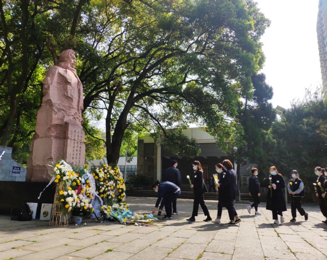 师生在施洋烈士雕像前默哀