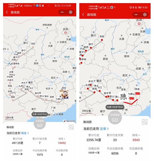 骄阳学子将每天微信运动数据导入“长征永远在路上”小程序,用“步数换里程”的方式模拟行走25000 里长征路,先后经过长征途中36个具有革命意义的事件或地点,模拟完成线上长征任务,最后实现“胜利会师”。