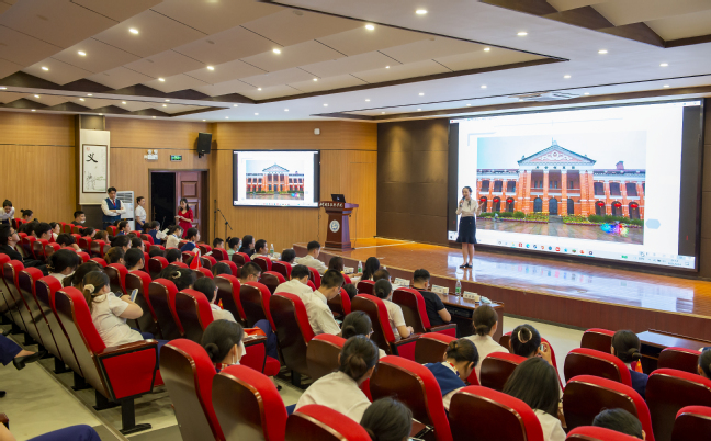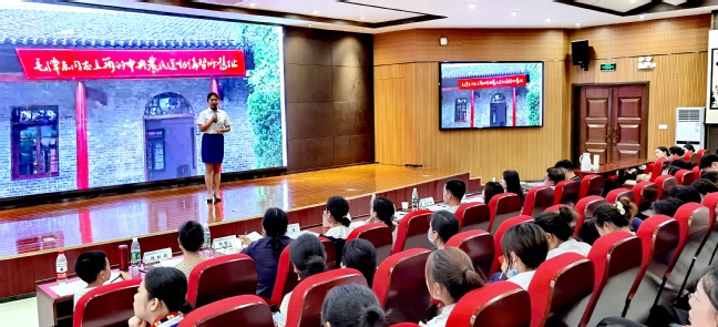 精彩的导游词讲解是导游人员需要具备的基本素质。在中文导游词讲解环节中,选手们依次上场,自信满满地向在场观众讲解着中山舰博物馆、罗田大别山、武汉革命博物馆、辛亥革命纪念馆、武昌毛泽东同志旧居等红色景点。选手们讲解准确生动,仪态大方得体,赢得在场师生阵阵掌声。旅管20302班选手吴雅丽现场表现令人印象深刻,未见其人先闻其声,她一边唱着《映山红》,一边走上讲台为大家介绍大别山景区,引领观众重温那段红色记忆。