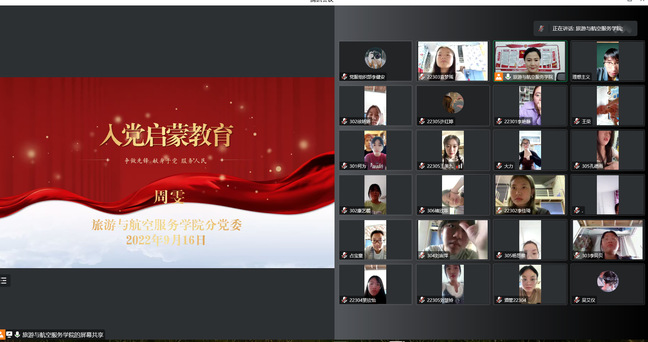 武职网讯(通讯员周雯 大学生记者李娅琪)9月16日至9月18日,旅游与航空服务学院分党委组织开展了以初心“引”初新系列线上入党启蒙教育活动。2022级全体新生共聚云端,开启了他们的入党“第一步”。学生党支部教师及2020级同学为新生带来了生动精彩、全面详实的入党启蒙宣讲。