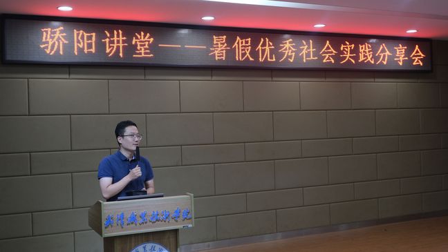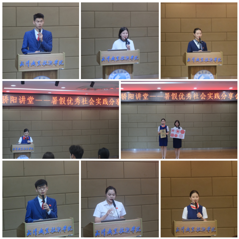 经评选,共有7名骄阳学子代表走上讲台,分享实践感悟。他们或在实习工作中历练自己,或深入乡村探访特殊留守儿童,或走入课堂宣讲防溺水安全小知识,或回到家乡了解家乡的非遗文化……在骄阳讲堂上,骄阳学子倾情讲述了2022年暑期中难忘的实践经历。